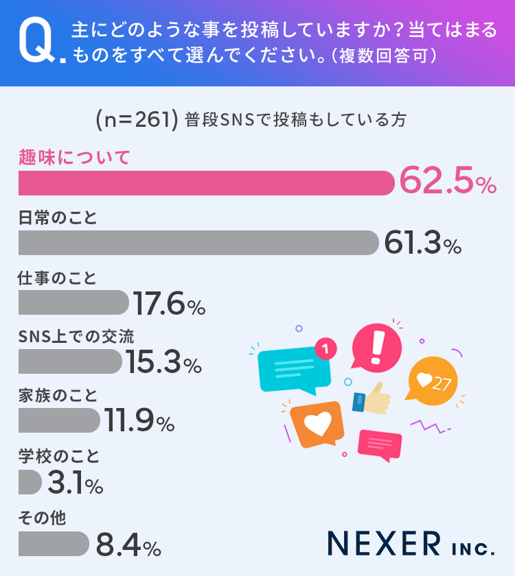 62.5%の方が「趣味について」、61.3%の方が「日常のこと」と回答しており、この2つが圧倒的票数でツートップを飾る結果となりました。