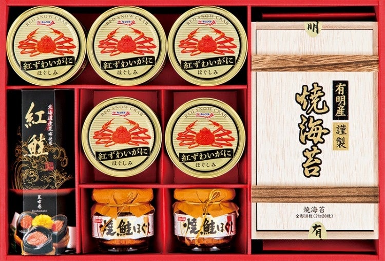 【内容】紅ずわいがに(ほぐしみ)90g×5 、ニッスイ 焼鮭ほぐし50g×2 、国産昆布 紅鮭昆布巻14cm 、柳川海苔本舗 有明産焼海苔 2切10枚×2袋