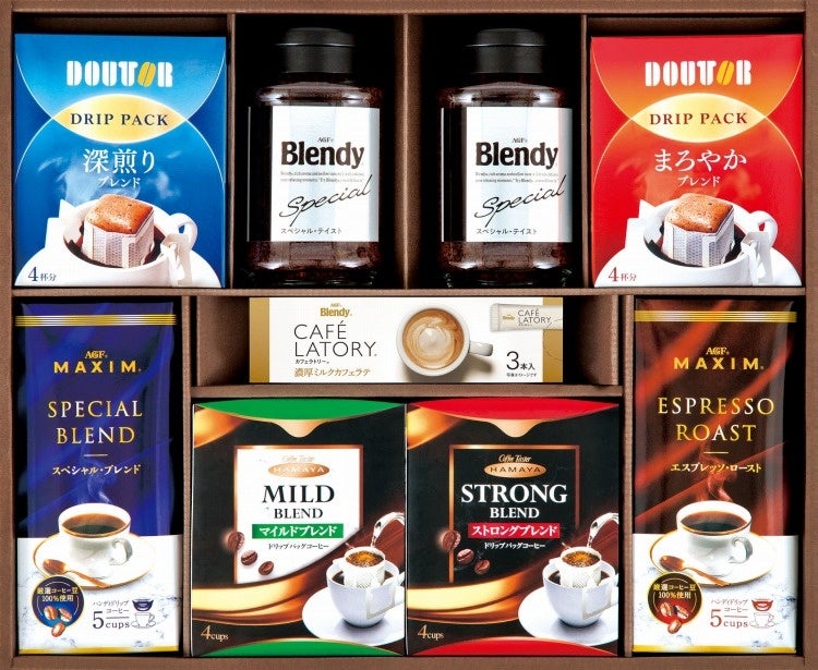 【内容】カフェラトリ-濃厚ミルク3本 、新ブレンディインスタントコーヒースペシャル70g×2 、ドトール ドリップパックまろやかブレンド6.5g×4P 、ドトールドリップパック深煎りブレンド6.5g×4P 、ハマヤドリップバッグストロングブレンド4P 、ハマヤドリップバッグマイルドブレンド4P 、マキシムハンディドリップエスプレッソロースト5P 、マキシムハンディドリップスペシャルブレンド5P