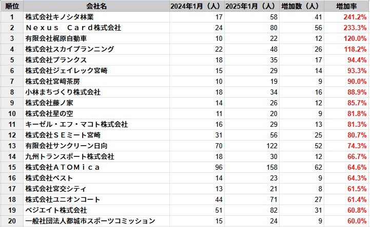 「誰もが活躍できる仕組みをつくる。」をミッションに掲げ、セールスチームの武器となるデータベース「SalesNow」を展開する株式会社SalesNow(本社:東京都渋谷区、代表取締役:村岡功規、以下「SalesNow」)は、国内550万社の企業情報を完全網羅した日本最大級のデータベース「SalesNow DB」より、宮崎県に本社を置く企業の2024年1月時点および2025年1月時点の従業員数データを分析し、従業員数増加率ランキングTOP20を発表しました。本ランキングは、各企業の成長スピードを可視化するものであり、新規雇用の創出や事業拡大の動向を明らかにしています。