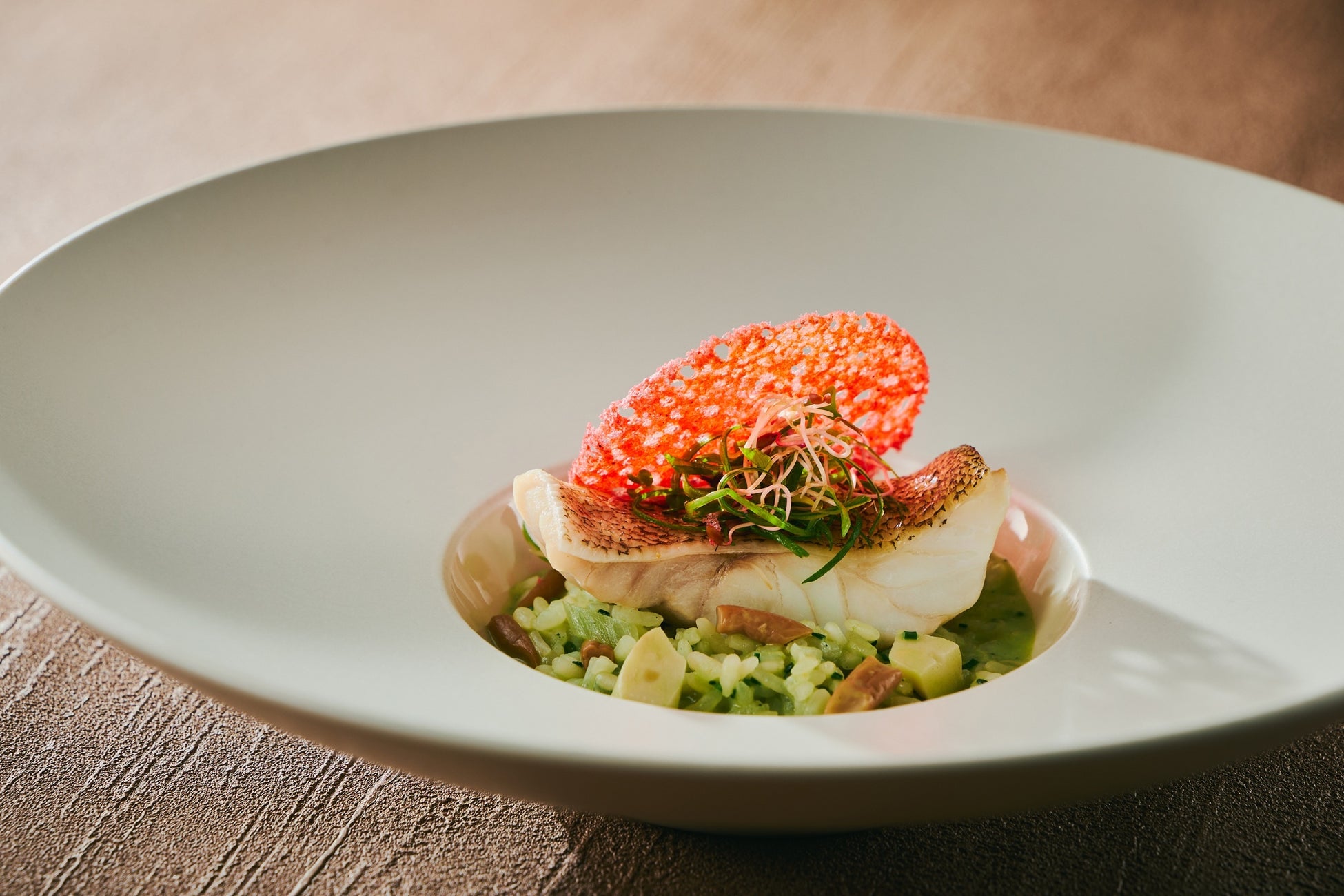 香ばしくふっくらと焼き上げた季節魚のポワレを、和の旨味を重ねた出汁で炊き上げた大阪産米のリゾットとともに。春の味覚の姫竹、蕗、ぜんまいを合わせ、この季節ならではの味わいに仕上げました。トップにあしらった香ばしいチュイルが、サクッとした食感をプラスし、美しい彩りに。抹茶のほのかな香りが全体を包み込み、春風のように軽やかな風味が広がる一皿です。
