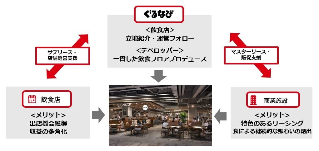 本事業は、ぐるなびが持つ飲食店ネットワークと蓄積された飲食に関するデータを活用し、商業施設の飲食エリアにおいて、コンセプト設計から飲⾷店誘致、店舗構築、フロア運営まで総合的にプロデュースをする事業です。ぐるなびが、飲⾷店へ⽴地紹介や運営フォローを⾏うことにより、事業規模を問わず、飲⾷店経営者へ出店機会を創出すると同時に、商業施設にとっても、これまでは誘致が困難であった中⼩規模の飲食店や地⽅で伸⻑・活躍している飲食店などを誘致することが可能になります。
