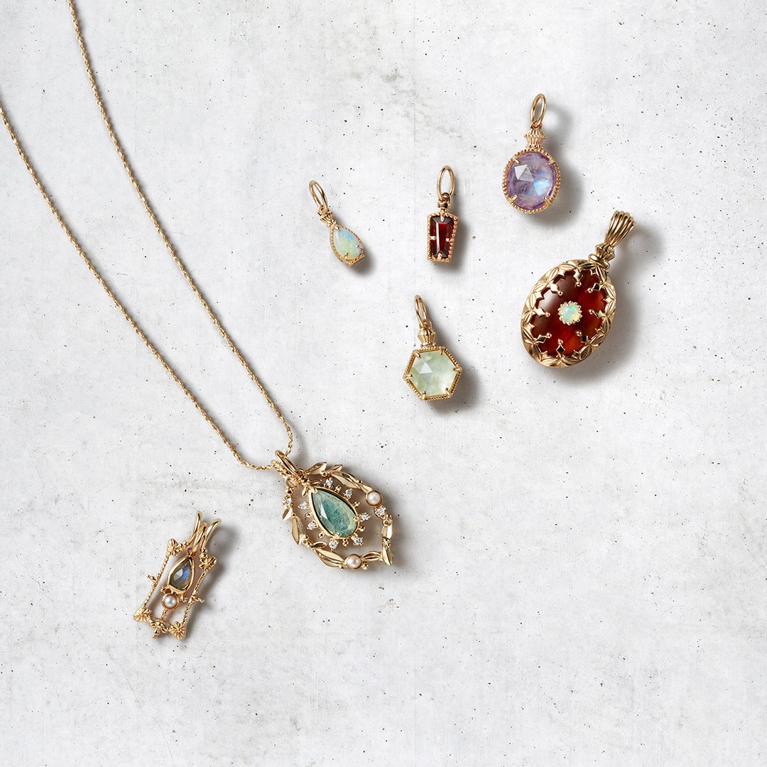 繊細な透かし模様や刻み彫りも、石の魅力をストレートに楽しめるミニマルデザインも、淡いニュアンスカラーの色石と絶妙にマッチ。