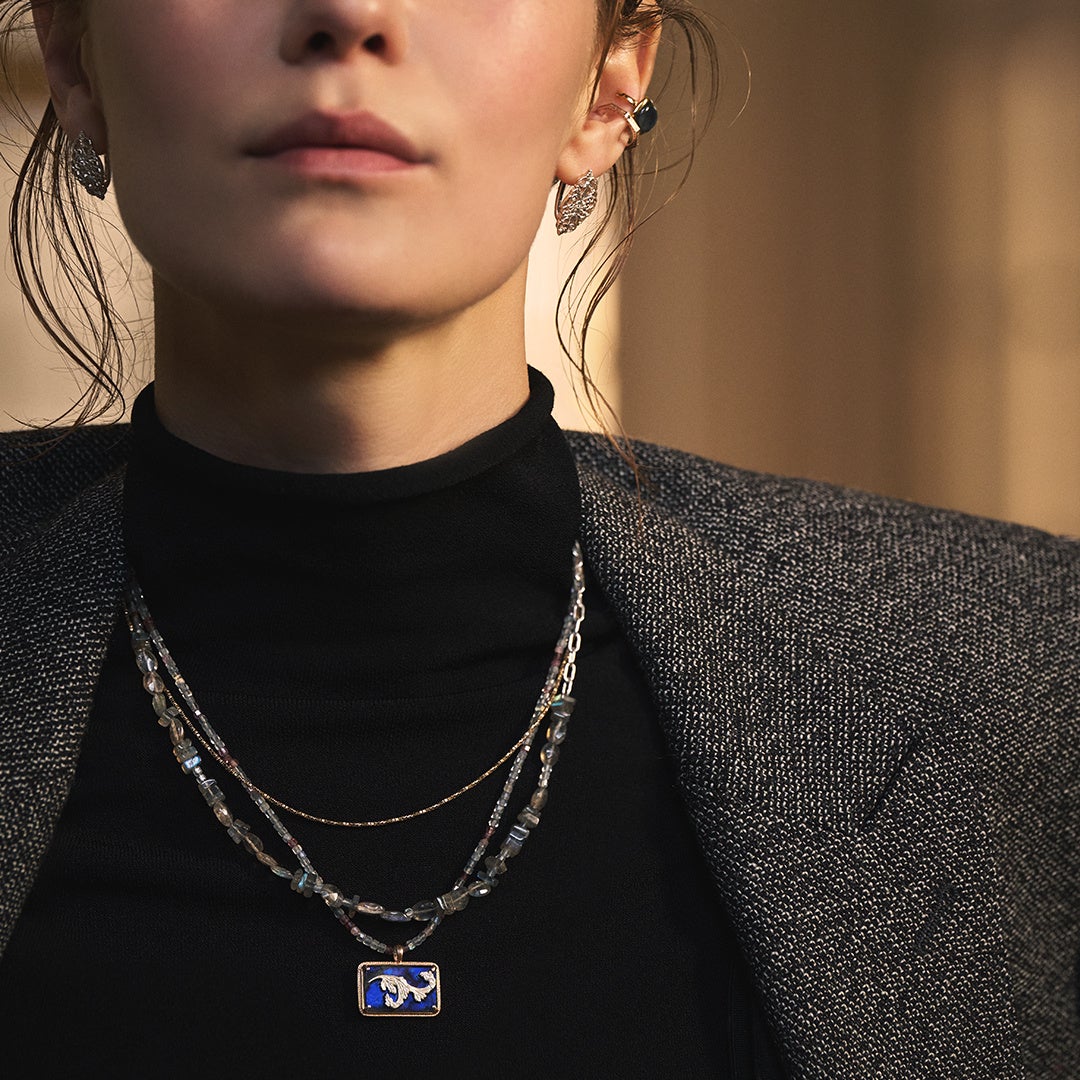 カラーストーンと額縁チャームを重ね合わせると、まるで一幅の絵画のようなデザインに。
