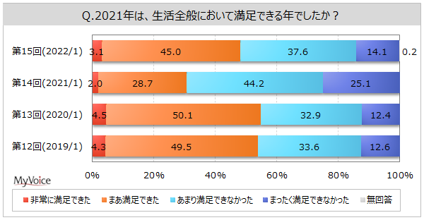 ■2021年の生活に満足できた人は5割弱。2021年調査時より増加したが、2020年調査時より低い