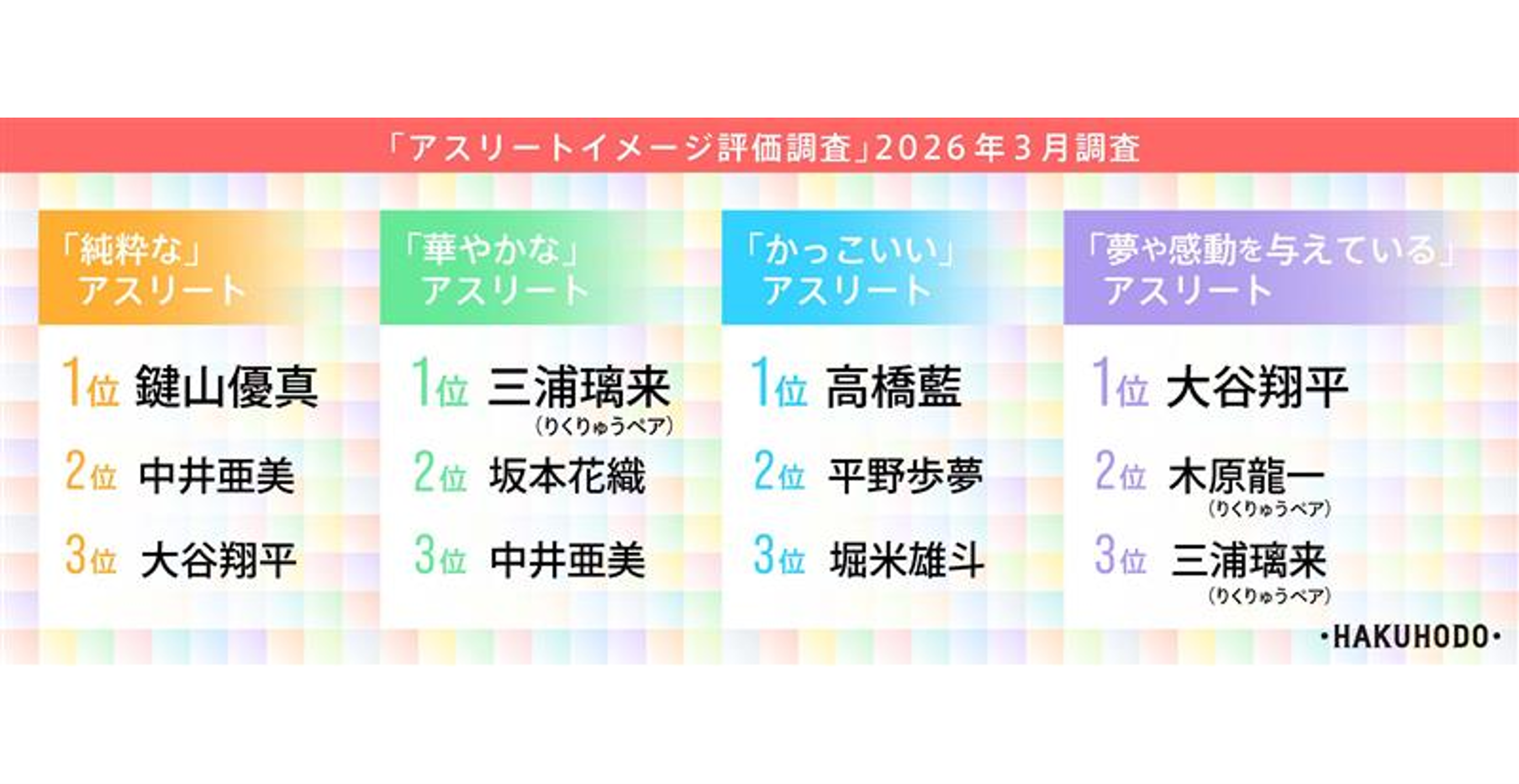 個別イメージでは、「純粋な」アスリートは、1位:鍵山優真(フィギュアスケート)、2位:中井亜美(フィギュアスケート)、3位:大谷翔平(MLB・大リーグ)、4位:池江璃花子(水泳<競泳>)、5位:北口榛花(陸上<マラソン/駅伝以外>)となりました。「華やかな」アスリートは、1位:三浦璃来(りくりゅうペア)(フィギュアスケート)、2位:坂本花織(フィギュアスケート)、3位:中井亜美(フィギュアスケート)、4位:木原龍一(りくりゅうペア)(フィギュアスケート)、5位:大谷翔平(MLB・大リーグ)とミラノ・コルティナ2026冬季オリンピックに出場していたフィギュアスケート選手が上位となりました。