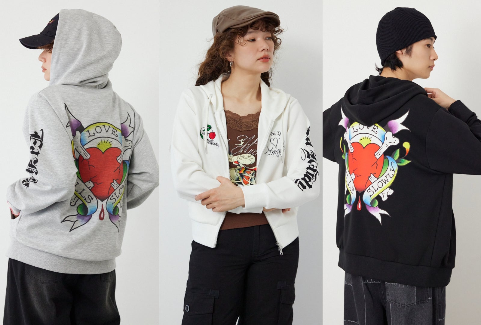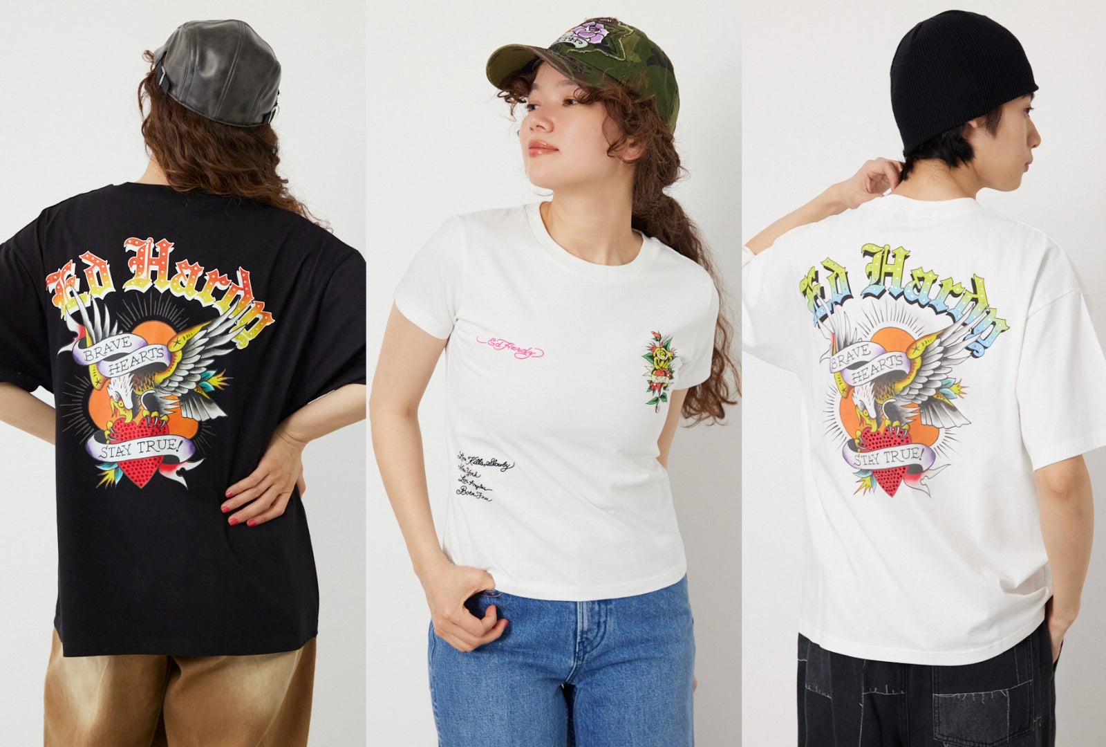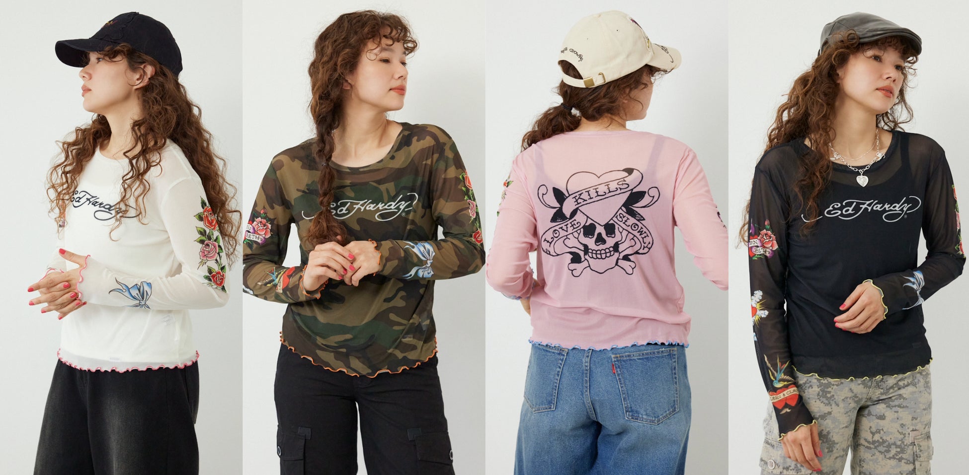 今回のコラボレーションでは、Ed Hardyのアイコニックなアートでもあるイーグルやハート、バラなどを、ジップパーカーやTシャツ・シアー素材のトップス・キャップにふんだんにデザインしました。