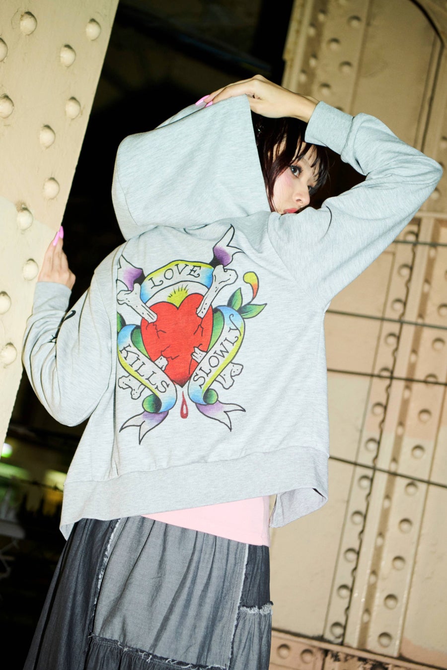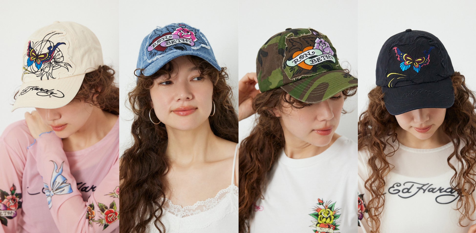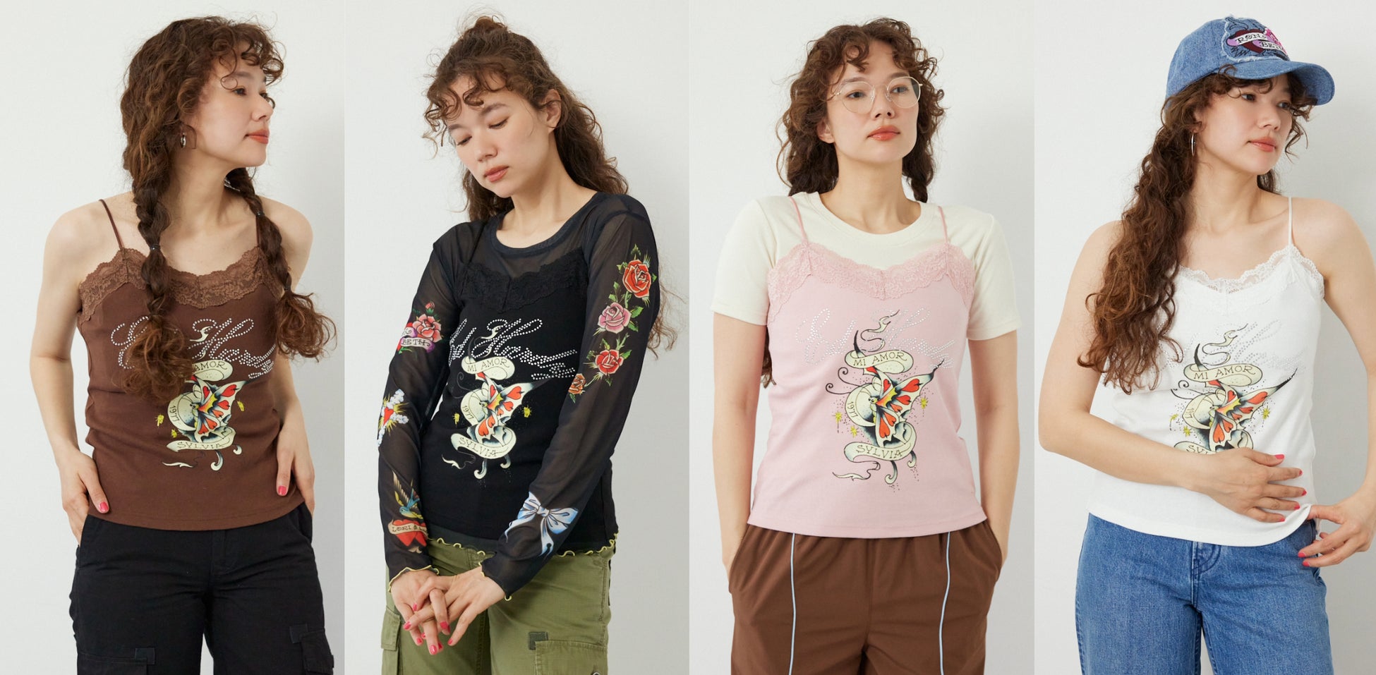 今回のコラボレーションでは、Ed Hardyのアイコニックなアートでもあるイーグルやハート、バラなどを、ジップパーカーやTシャツ・シアー素材のトップス・キャップにふんだんにデザインしました。