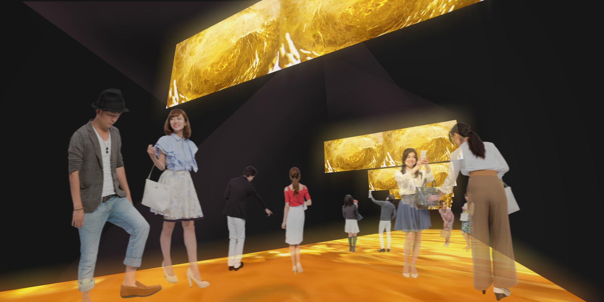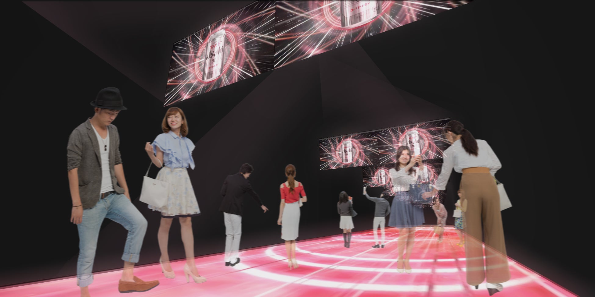 試飲会場までの通路となる「スーパードライ SKY ROAD」を大幅にリニューアルしました。床面にプロジェクションマッピングを投影し、お客さまの動きに合わせて反応する映像演出を楽しめます。容器へ充填後、商品が運ばれ、お客さまが国内外で「スーパードライ」を楽しむ様子を躍動感とリズム感のある映像と音楽で表現します。ツアー体験の締めくくりとなる「スーパードライホール」での、“工場できたて”の「スーパードライ」の試飲に向かう気持ち高まる瞬間を演出します。