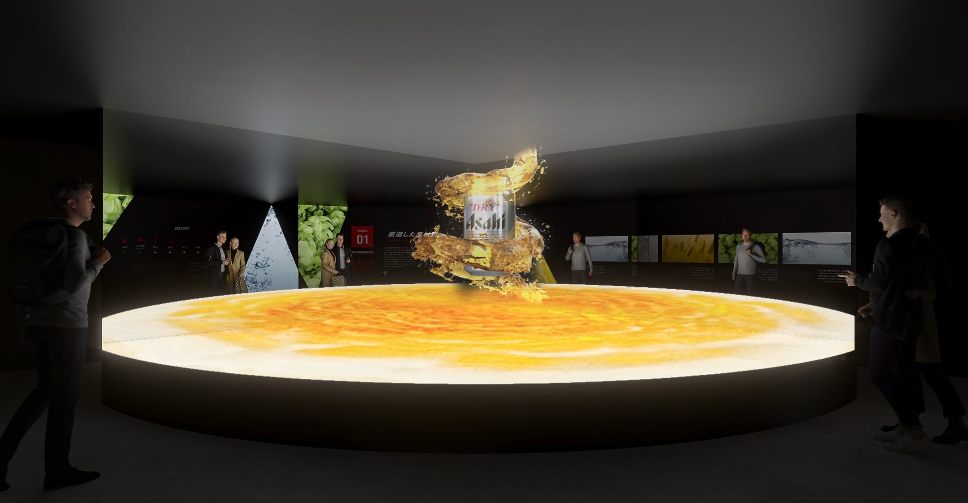 今回のリニューアルでは、「スーパードライ」の原材料について紹介するコーナーに「スーパードライ CIRCLE VIEW」を新設しました。空中に物体が浮いているように見えるホログラムディスプレイとプロジェクションマッピングを使った立体的な映像で、仕込釜などの中で起きる工程を演出します。
