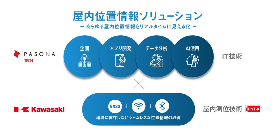 パソナテックの強みであるソフトウェア開発技術と川崎重工が屋内測位インフラとして日本全国に順次展開している屋内位置情報サービス「iPNT-KTM (アイピントケイ)」を組み合わせたソリューションを提供