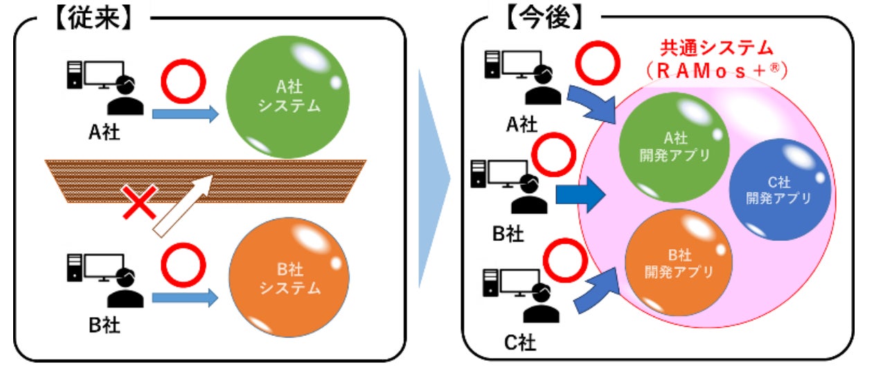 従来、得られたデータの処理は、会社毎の独立したシステムで行われておりましたが、日本線路技術が開発した「RAMos+Ⓡ」により、鉄道各社が同じプラットフォーム上で処理を行うことが可能となります。各社がメンテナンスに使用するアプリ等を共有して使用することが可能となり、開発費の削減に加えて、メンテナンスの生産性が向上します。さらには、各社のアプリの共有により鉄道業界全体で線路メンテナンスの技術の発展が期待できます。