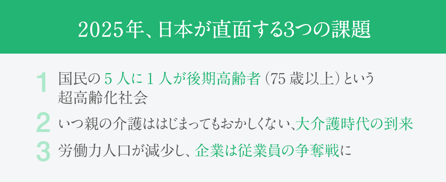 要介護者がますます増加するなか、介護離職や介護によるパフォーマンスの低下を防止するため、企業も対策を迫られています。