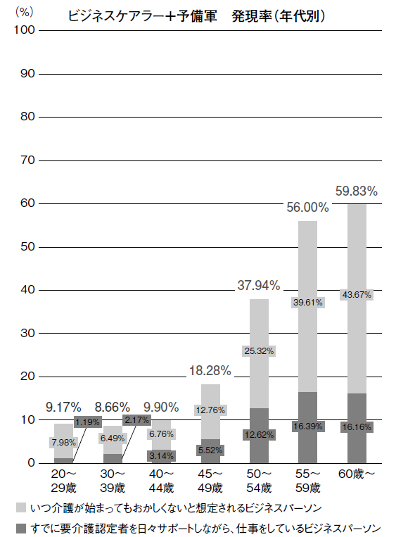 現在進行形のビジネスケアラーだけに注目すれば、すでに45〜49歳で20人に1人、50〜54歳では8人に1人が当事者です。そのうえ予備軍まで含めると、この問題が社会レベルで重要なものであるといえます。