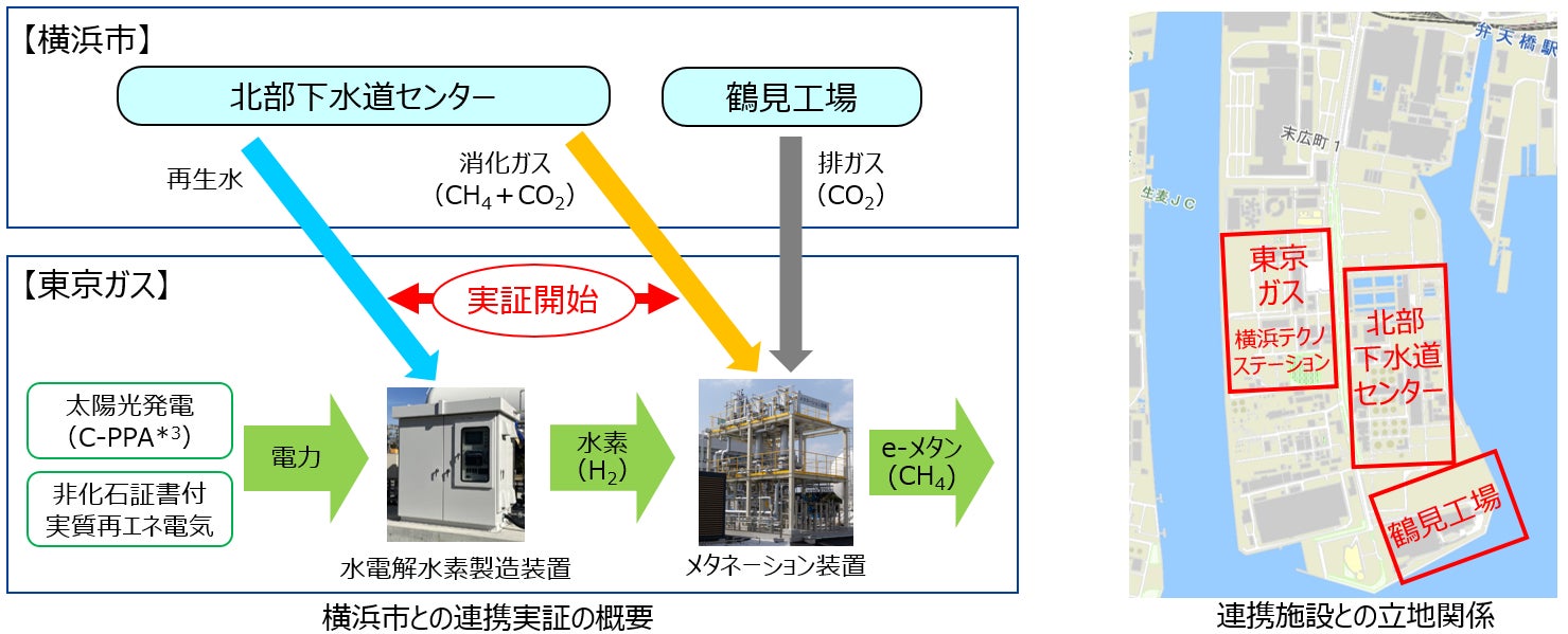 東京ガス株式会社(社長:笹山 晋一、以下「東京ガス」)は、このたび、2022年1月に横浜市と締結した協定(*1)に基づき、横浜市北部下水道センター(以下「北部下水道センター」)の再生水(下水処理した水をろ過した水)と消化ガス(下水汚泥を処理する工程で発生するバイオガスで、CH4とCO2の混合ガス)を東京ガス横浜テクノステーションにあるメタネーション実証設備に輸送し、水素およびe-methane(以下「e-メタン」)製造の原料として利用する共同実証(以下「本実証」)を開始しました。