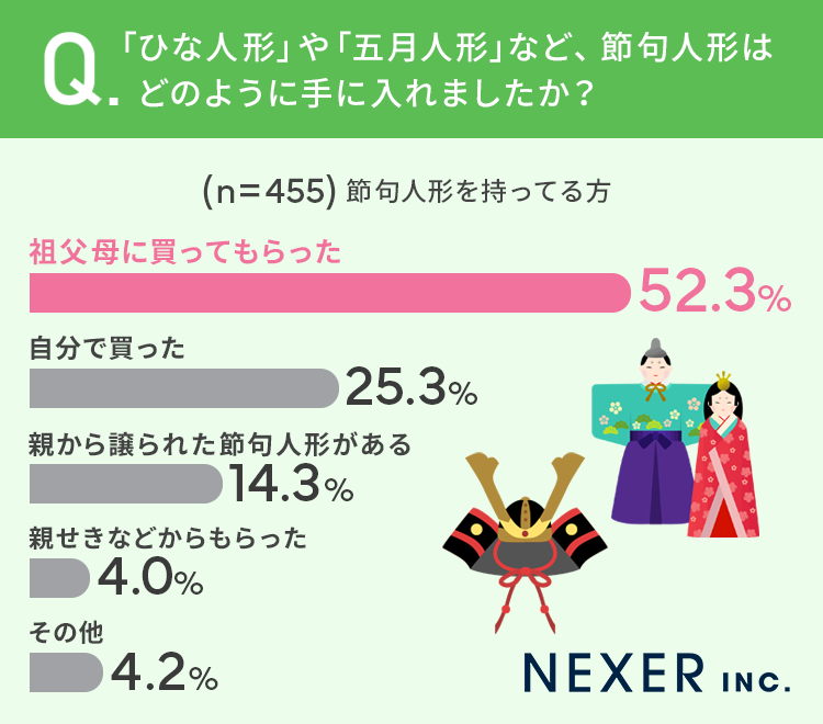 さらに合計で57.3%の方が「ひな人形」を、44.2%の方が「五月人形」を持っていると回答していました。
