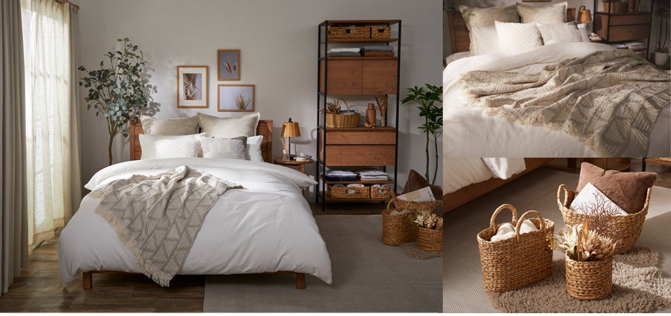 やわらかな質感のフリーカバーが、ベッド周りにやさしい雰囲気を演出。肌寒い時にはさっと羽織れるため、季節の変わり目にも重宝します。床に置いたり棚に並べるだけでも絵になるバスケットは、リネンや小物をさっとしまえて「魅せる収納」にぴったりです。新登場したスクエア型をはじめ、様々な形とサイズの中から、お好みに合わせてお選びいただけます。