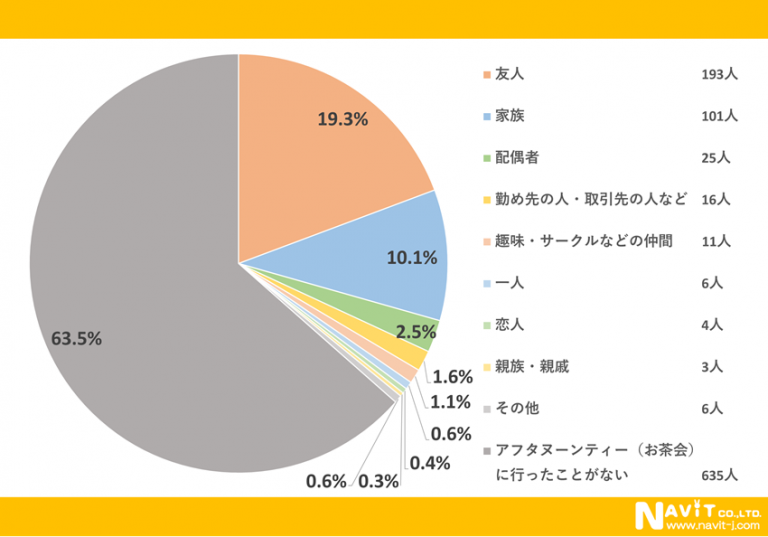 アフタヌーンティー(お茶会)には誰といくのが1番多いかというと、「友人」が19.3%で1番でした。次に「家族」10.1%、「配偶者」2.5%と続いています。時間をかけてゆっくりとお茶を楽しむので、気が合う仲間で行くことが多いのでしょう。