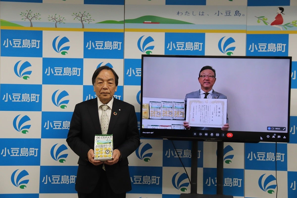 今回の寄付については、小豆島町との協議により「オリーブトップワンプロジェクト推進事業」に対する企業版ふるさと納税として寄付したことから、小豆島町より感謝状を贈呈いただきました。