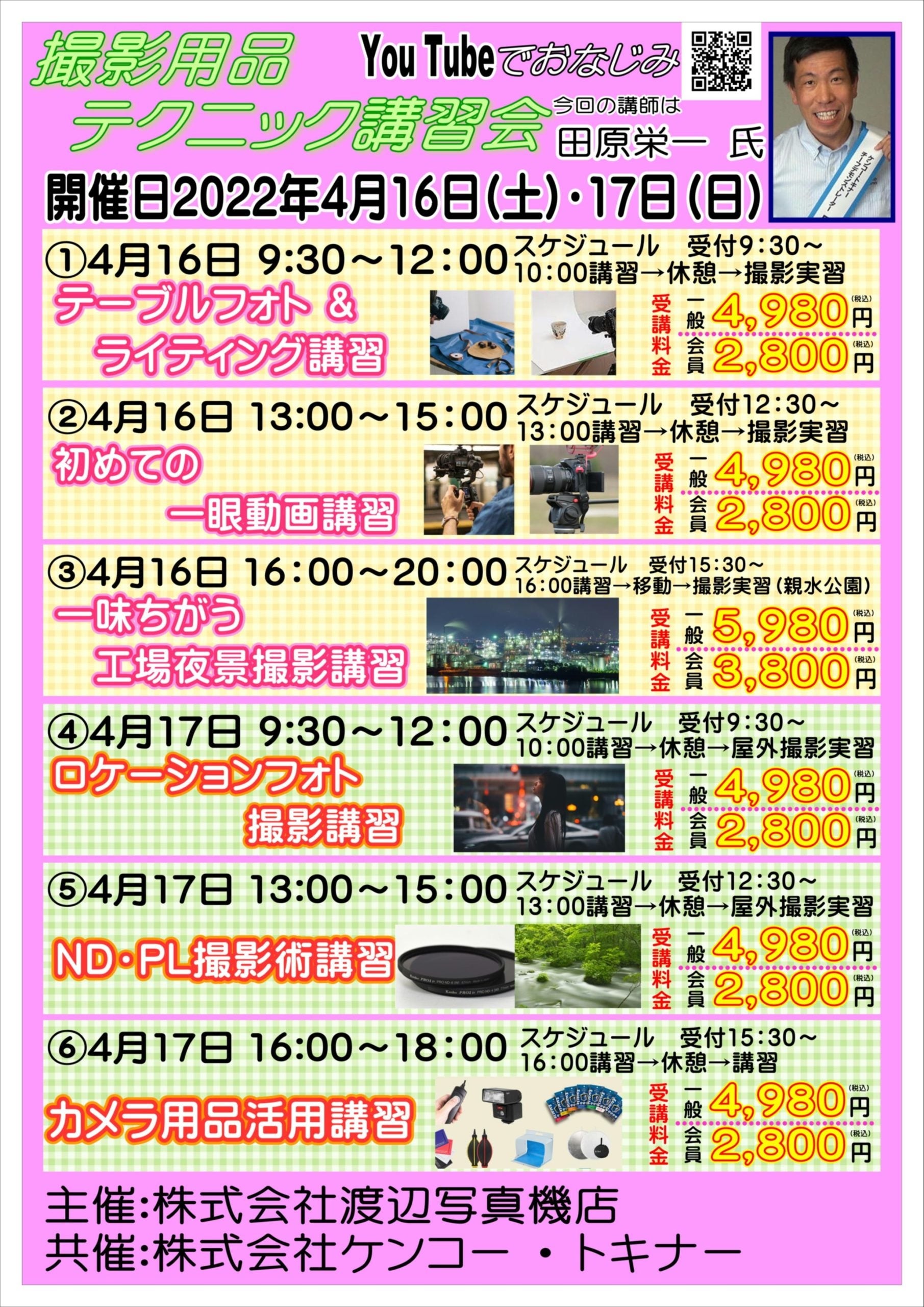 このイベントは、カメラのワタナベ様での久しぶりの開催で、ケンコー・トキナーチーフデモンストレーターとして、28年にわたり活躍し続ける田原栄一が単独で2日間で6講座という、新たな挑戦となるものです。