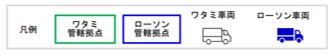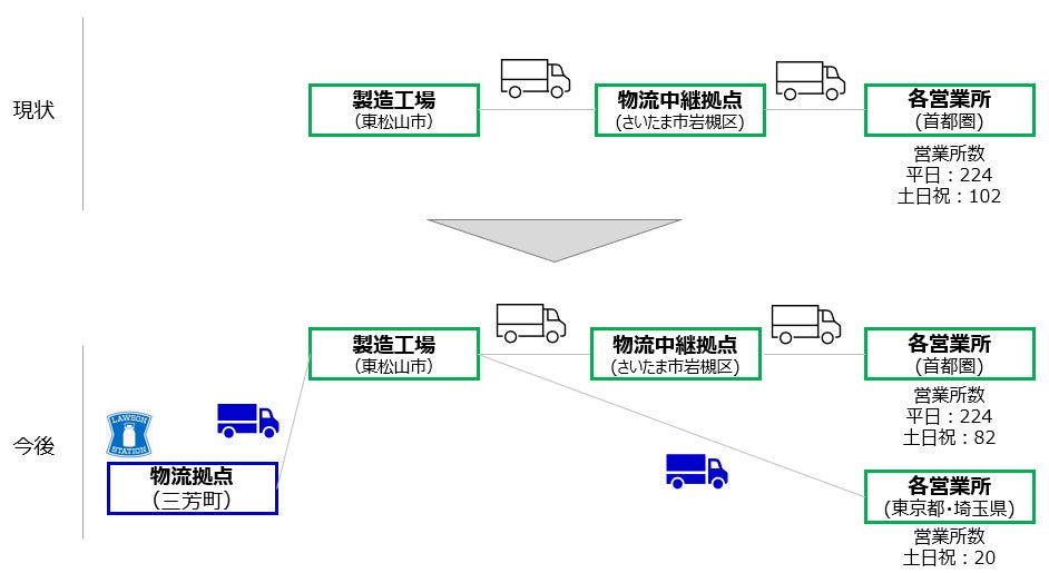 「ワタミの宅食」の物量が減る土日祝に関して、埼玉県三芳町を物流拠点としているローソン車両で、東松山市の製造工場にて商品を積み込み、「ワタミの宅食」の対象となる営業所へ配送。
