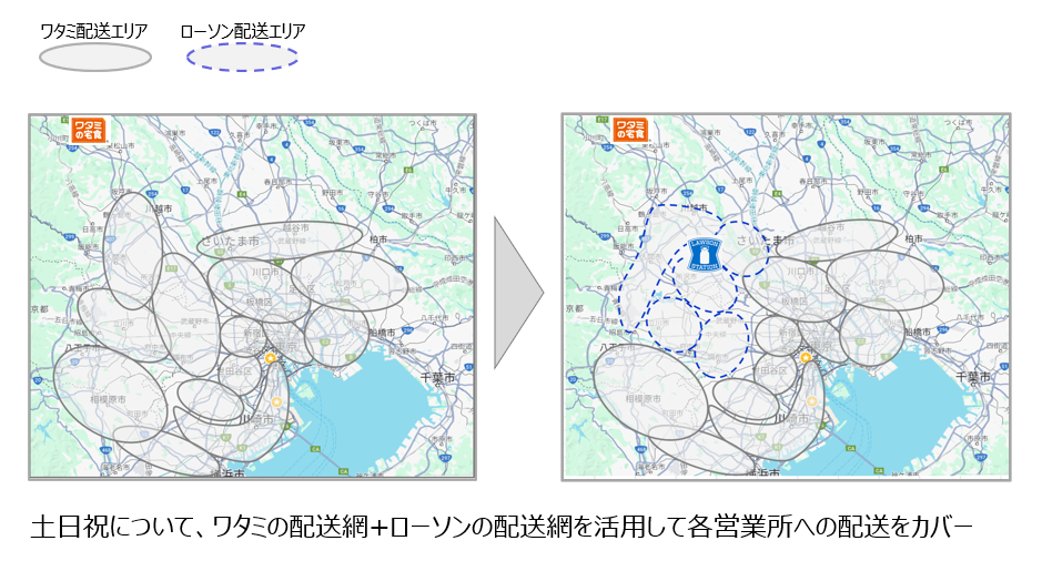 土日祝について、ワタミの配送網+ローソンの配送網を活用して、各営業所へ配送