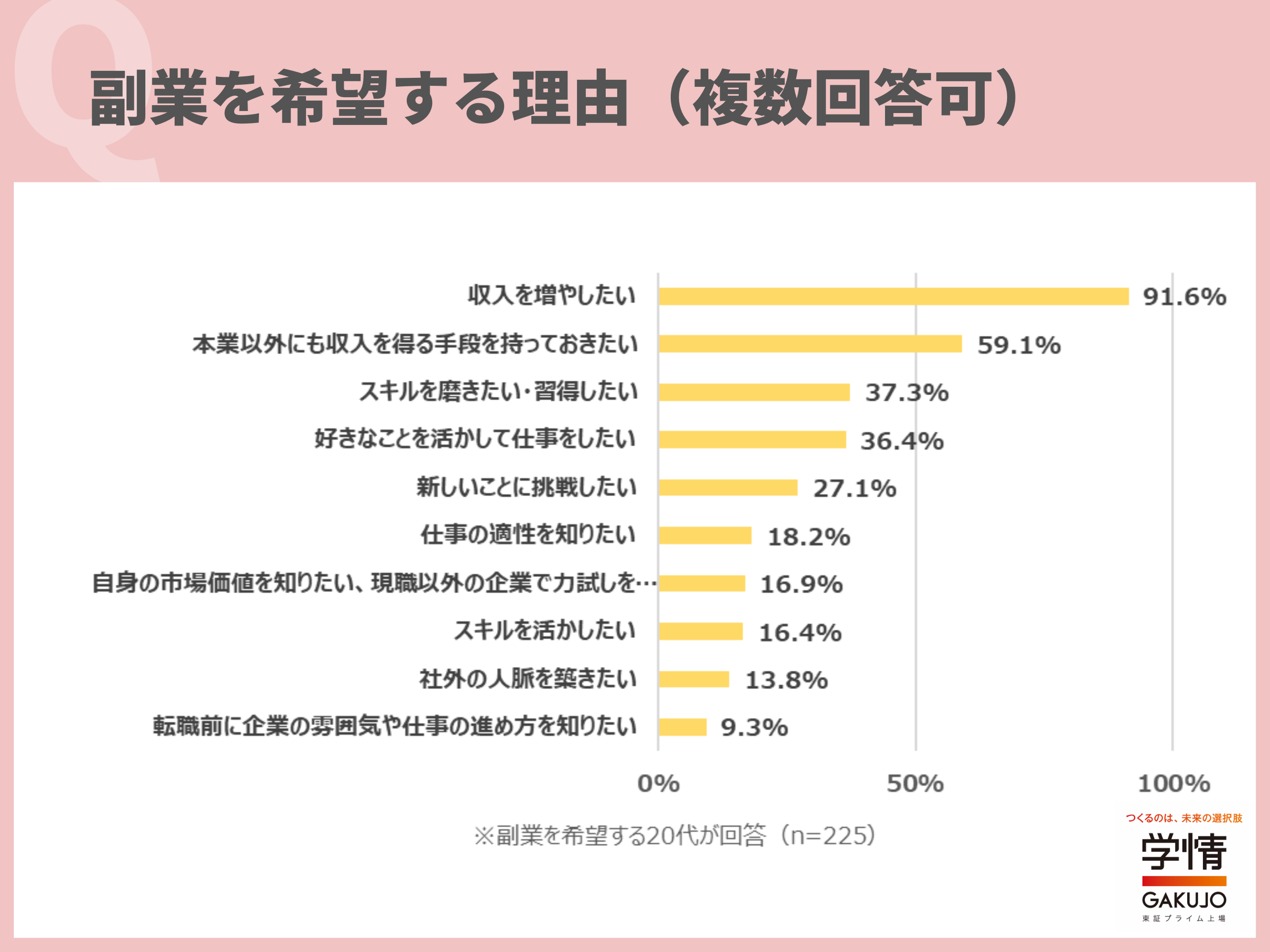 副業を希望する理由は、「収入を増やしたい」が91.6%で最多。次いで、「本業以外にも収入を得る手段を持っておきたい」59.1%、「スキルを磨きたい・習得したい」37.3%、「好きなことを活かして仕事をしたい」36.4%が続きました。