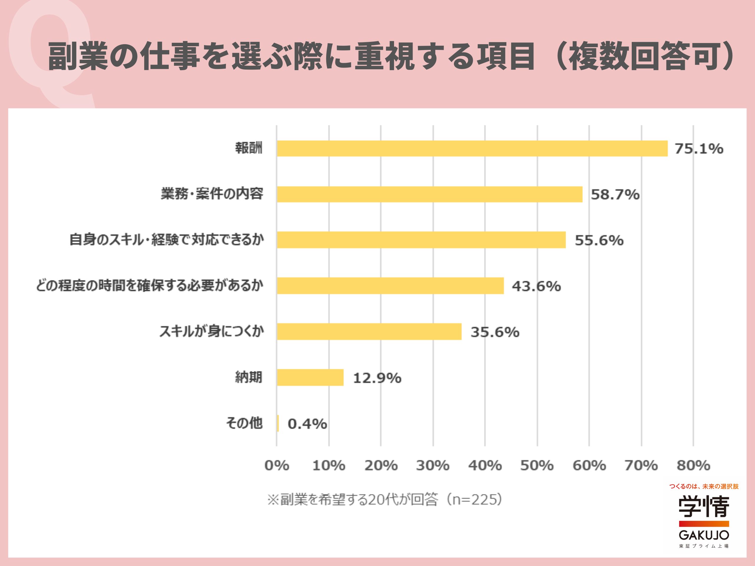 副業の仕事を選ぶ際に重視する項目は、「報酬」が75.1%で最多。次いで、「業務・案件の内容」58.7%、「自身のスキル・経験で対応できるか」55.6%が続きました。