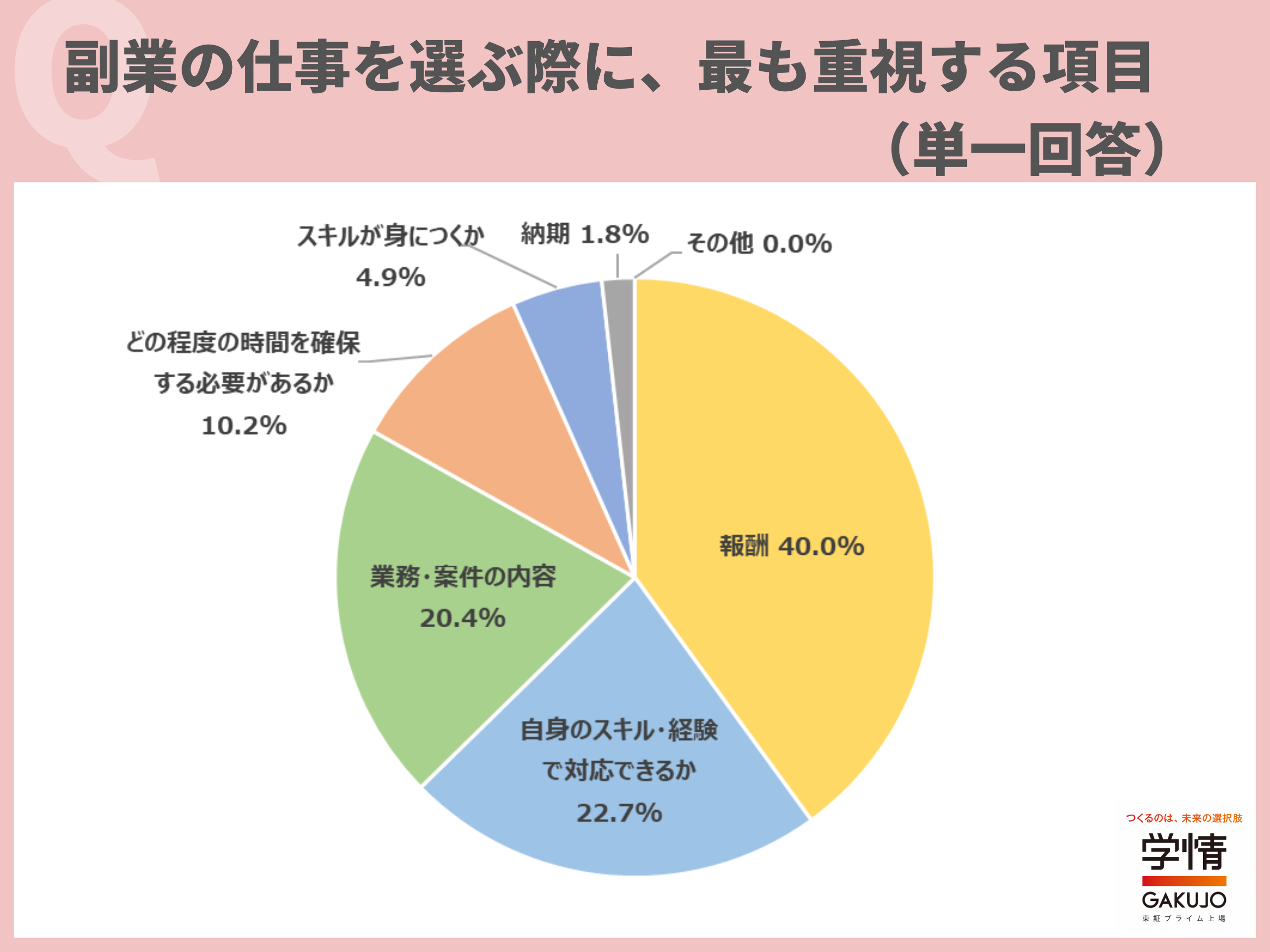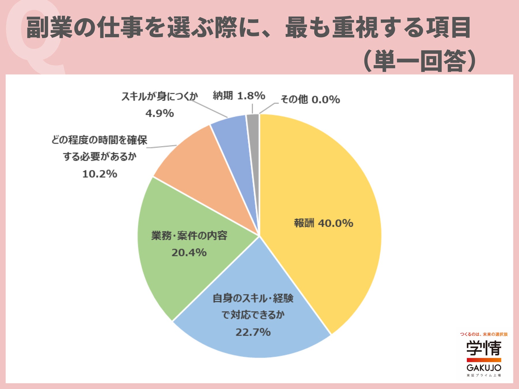副業の仕事を選ぶ際に、最も重視する項目(単一回答)は、「報酬」が40.0%で最多。次いで回答を集めた項目は、前述の「重視する項目(複数回答可)」から順位が入れ替わり、「自身のスキル・経験で対応できるか」22.7%、「業務・案件の内容」20.4%となりました。約4割の20代が「報酬」を最重視しているものの、「自身のスキル・経験で対応できるか」を最も重視して副業案件を選ぶ20代も2割を超えることが分かります。「収入を増やすことが目的なので、報酬を重視している」「本業に影響のない範囲で取り組みたい」「自分のスキルで対応できない仕事を受けてしまったら、価値を提供できないし、自分自身も困ると思う」といった声が寄せられました。