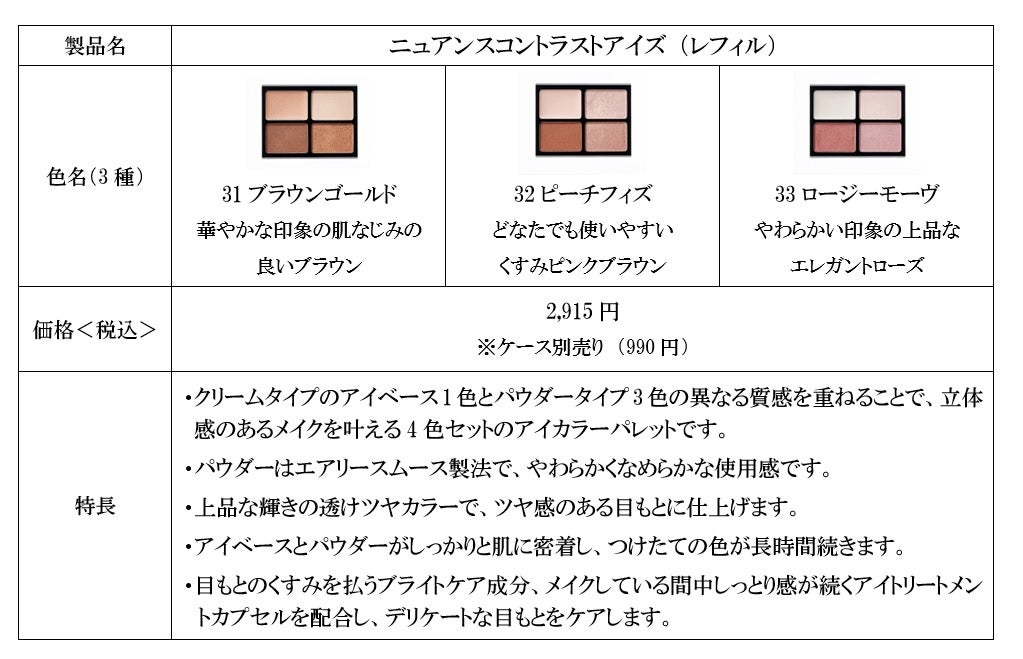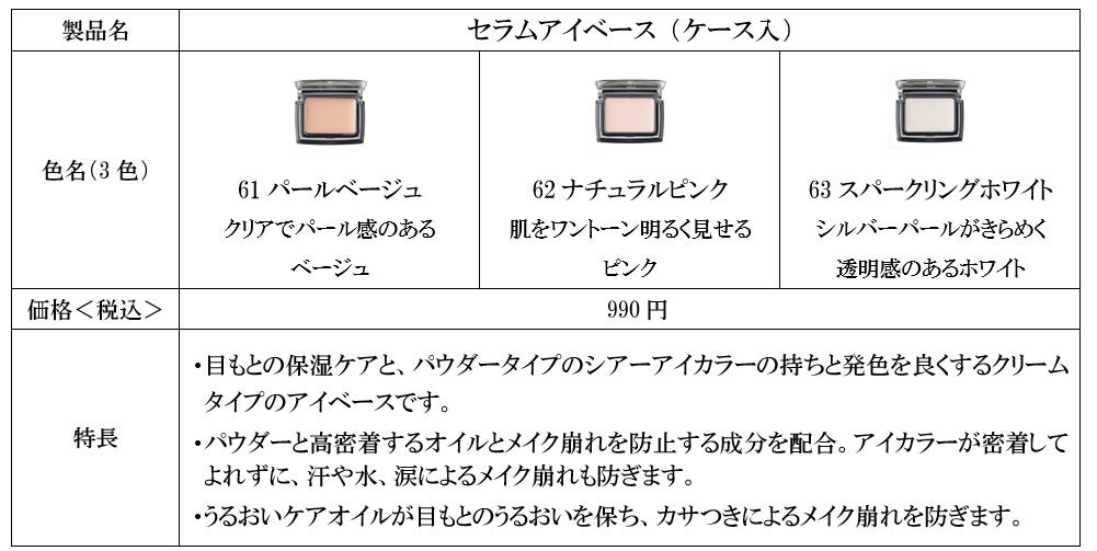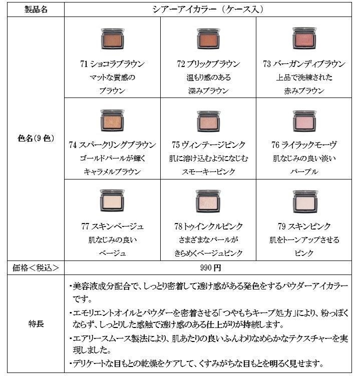 また、同時に「ニュアンスコントラストアイズ」にセットされているクリームタイプの「セラムアイベース」(全3色)とパウダータイプの「シアーアイカラー」(全9色)も、全色単品で発売します(各990円<税込>)。