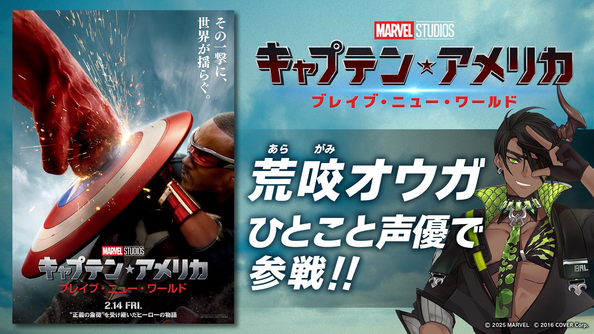マーベル・スタジオ作品をこよなく愛する荒咬オウガが、ついにその夢を叶え、マーベル・スタジオ最新作『キャプテン・アメリカ:ブレイブ・ニュー・ワールド』の日本語吹替版にひとこと声優として出演することが決定いたしました。