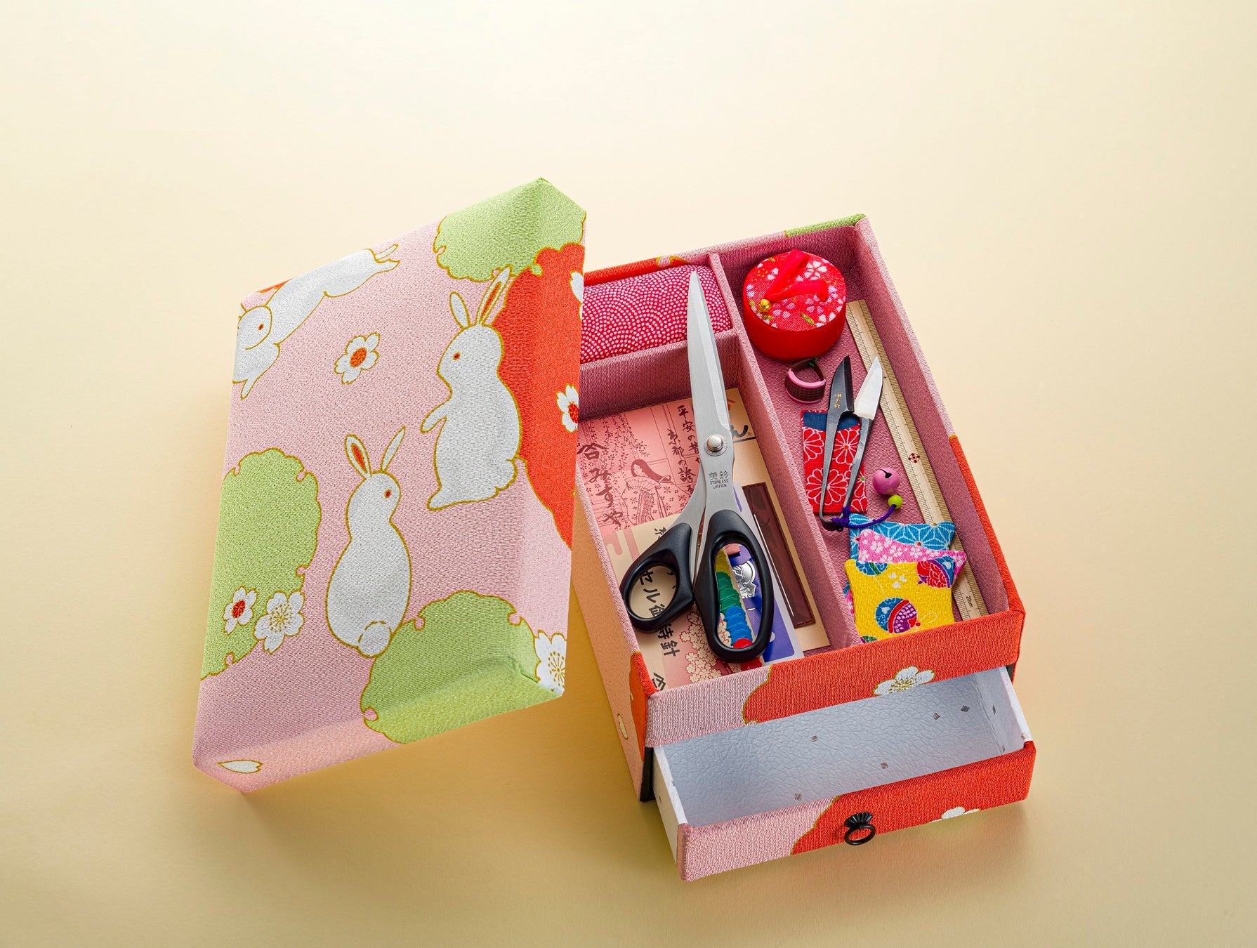 ◇みすや忠兵衛【松原通高倉西入ル】/引出し付お裁縫揃い「三羽のうさぎ」乙女色