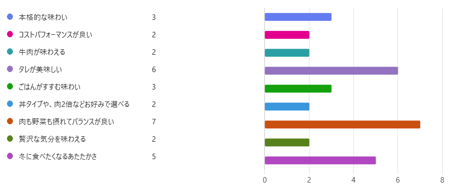 最も多くの票を集めたのは『炭火が香る焼鳥が美味しい』というポイントでした。以下2位は『つくねのコリコリ食感がクセになる』、『タレが美味しい』でした。