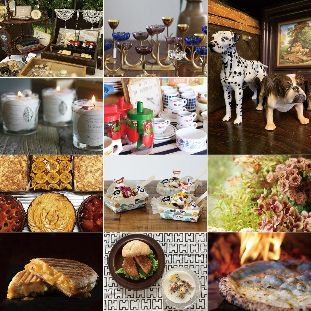 こだわりのアンティーク雑貨や古道具、洋服、焼菓子などを扱う様々なショップが集まるマルシェ