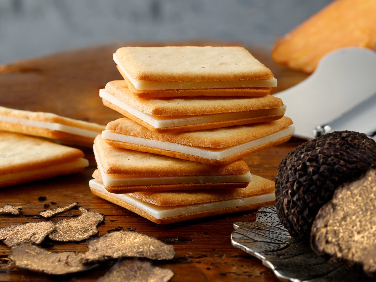北海道産牛乳とチェダーチーズ、トリュフを混ぜ込んだクッキーに、トリュフ風味のチョコレートをサンドした「トリュフ&チェダークッキー」は、世界三大珍味の1つであるトリュフを使用した、ちょっぴり大人のプレミアムスイーツです。(チーズパウダー中チェダー60%以上使用)