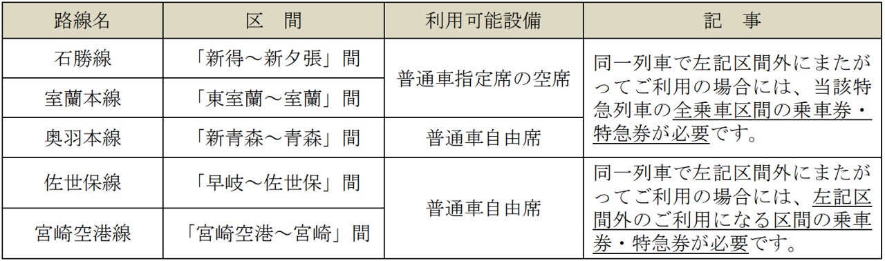 ◆以下の区間については、特例として特急列車の普通車自由席等がご利用いただけます。