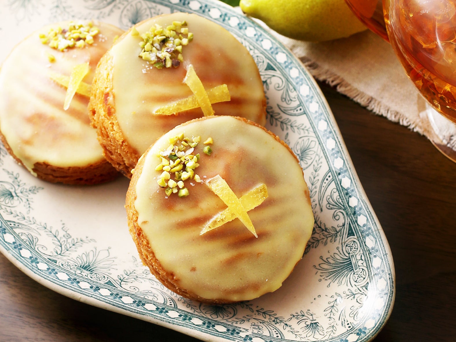 発酵バターの風味豊かな生地に爽やかなレモンアイシングで仕上げ、ピスタチオとゲランドの塩のアクセントを添えたガレット・ブルトンヌ。