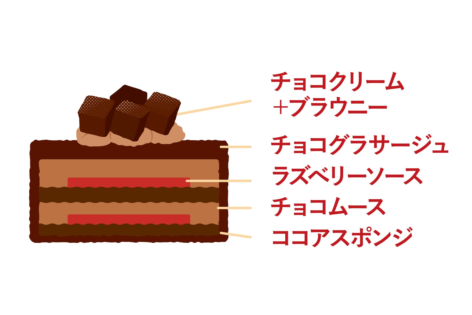 ね、艶やかなチョコのグラサージュで仕上げました。トッピングにしっとり食感のブラウニ