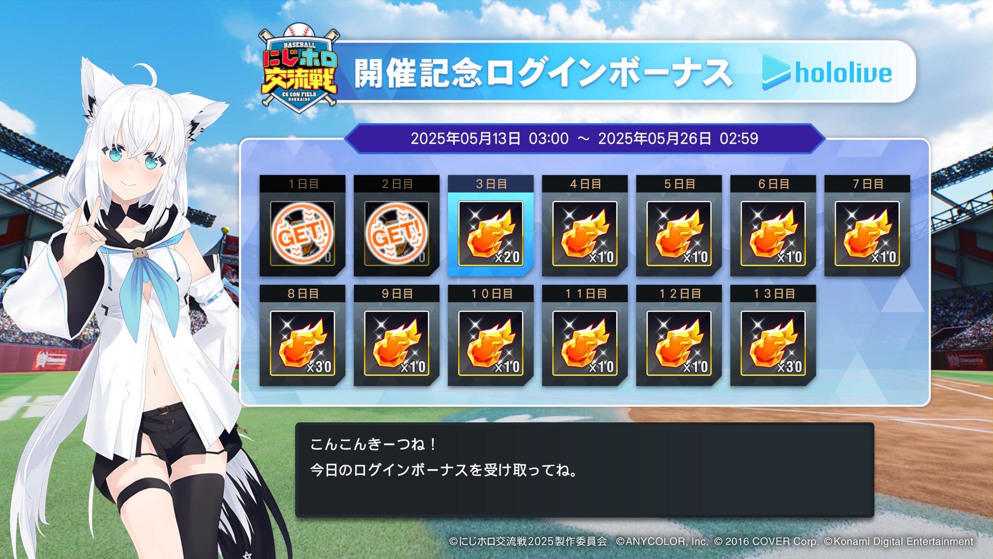「にじホロ交流戦2025」の開催を記念して、同時に2種類の期間限定特別ログインボーナスを開催!チェアマンである「笹木咲」(にじさんじ所属)「白上フブキ」(ホロライブ所属)の2名にログインボーナスを見守っていただきましょう!