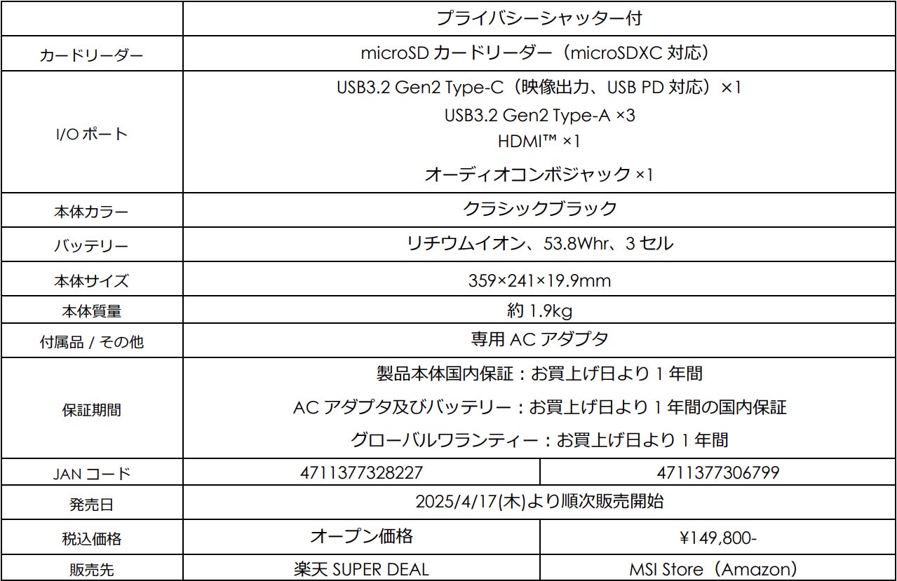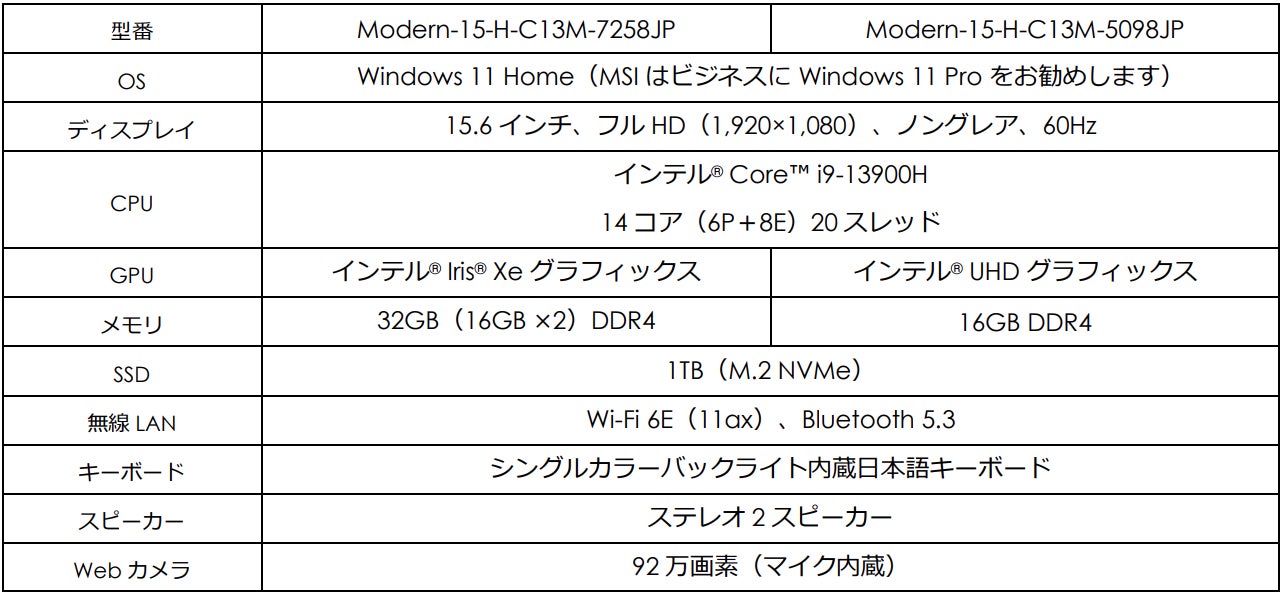 また、「“軽さ”ではなく“速さ”」コンセプトにしたビジネスノートPCの15.6インチモデル「Modern 15 H C13M」シリーズのバリエーションモデルを2025年4月17日(木)より順次発売いたします。
