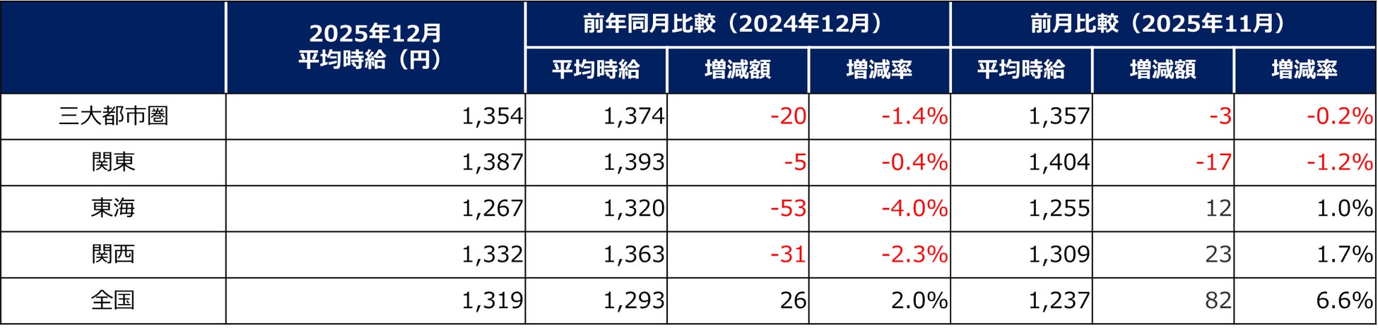 12月度のエリア別平均アルバイト時給は、三大都市圏全エリアで前年同月マイナスに。