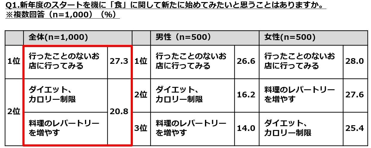 ・新年度のスタートを機に「食」に関して新たに始めてみたいと思うことは、「行ったことのないお店に行ってみる」が約3割で最も多く、次いで「ダイエット」「料理のレパートリー増やす」が約2割と続く。新たに何か始めたいと思っている女性は8割弱、男性より2割程度高い傾向。