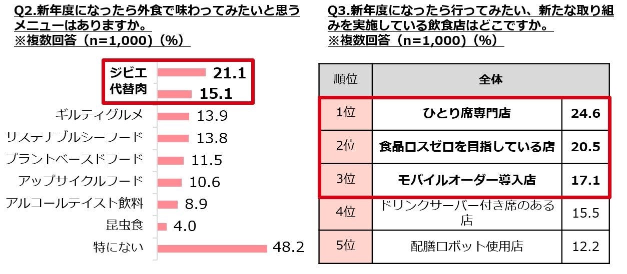 ・新年度に外食で味わってみたいメニューは「ジビエ」が21%で最も多く、「代替肉」が15%。