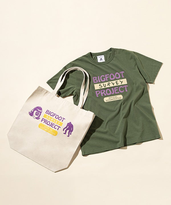 今回の企画として、EKALのブランドとアウトドアの親和性、そしてTINY GARDEN 蓼科の施設をイメージしたアートワークを提案していただき、おなじみの「BIGFOOT SURVEY PROJECT」をデザインした、Tシャツ、キャップ、トートバッグ、ピンバッジ(随時販売予定)の4アイテムのラインナップ。