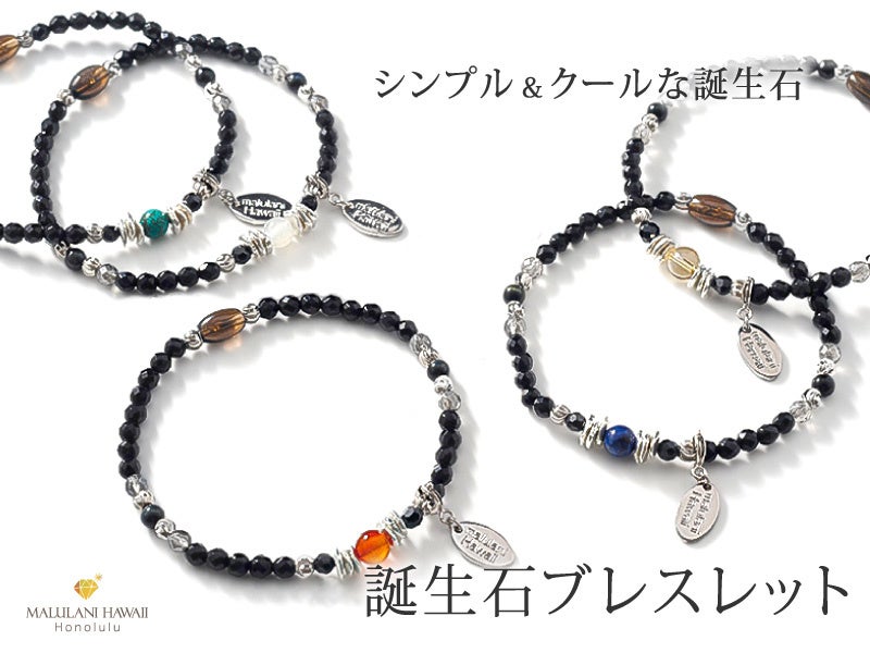 神の御加護をという意味をもつハワイ語「Malulani」と刻印のアイテムを組み込み、持つ人のお守りになりますようにとひとつひとつ願いをこめてお作りした、マルラニハワイの誕生石ブレスレットを、この機会にぜひお楽しみください。