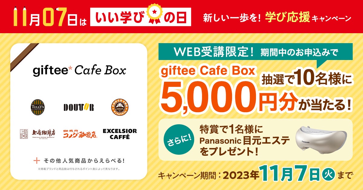 2023年11月1日(水)~2023年11月7日(火)23:59までのキャンペーン期間中に、生涯学習のユーキャンのWEBサイト( https://www.u-can.co.jp )から受講をお申込みいただいた方の中から抽選で10名様にgiftee Cafe Box5,000円分が当たる!さらに特賞で1名様にPanasonic社製「目元エステ」をプレゼント!