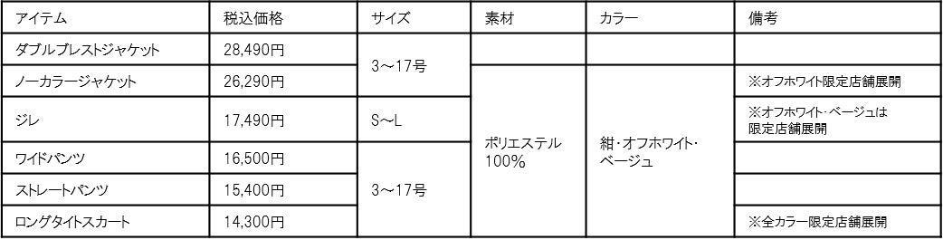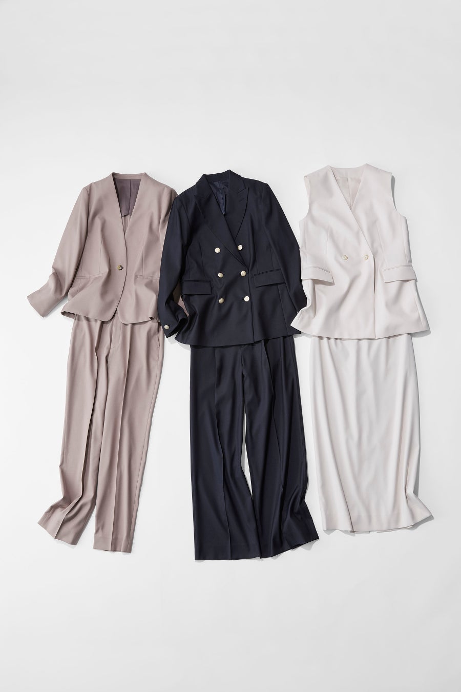 ジャケットはノーカラーとダブルブレストデザインの2型、ボトムはすっきりとした装いが叶うストレートパンツと、ハンサムなワイドパンツ、上品なロングタイトスカートの3型をご用意。ジレも加わり様々な着こなしがお楽しみいただけます。ベーシックな紺色、春らしさを感じるオフホワイトとベージュの3カラーを展開。