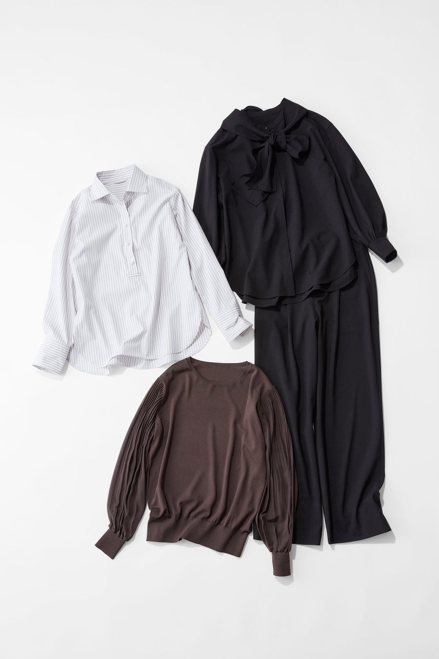 トップスは、ブラウス・シャツ・ニットと豊富なデザインバリエーションで展開。今年は新たに結び方をアレンジできるボウタイ付きのブラウスとパンツのブラウスセットアップをご用意しました。