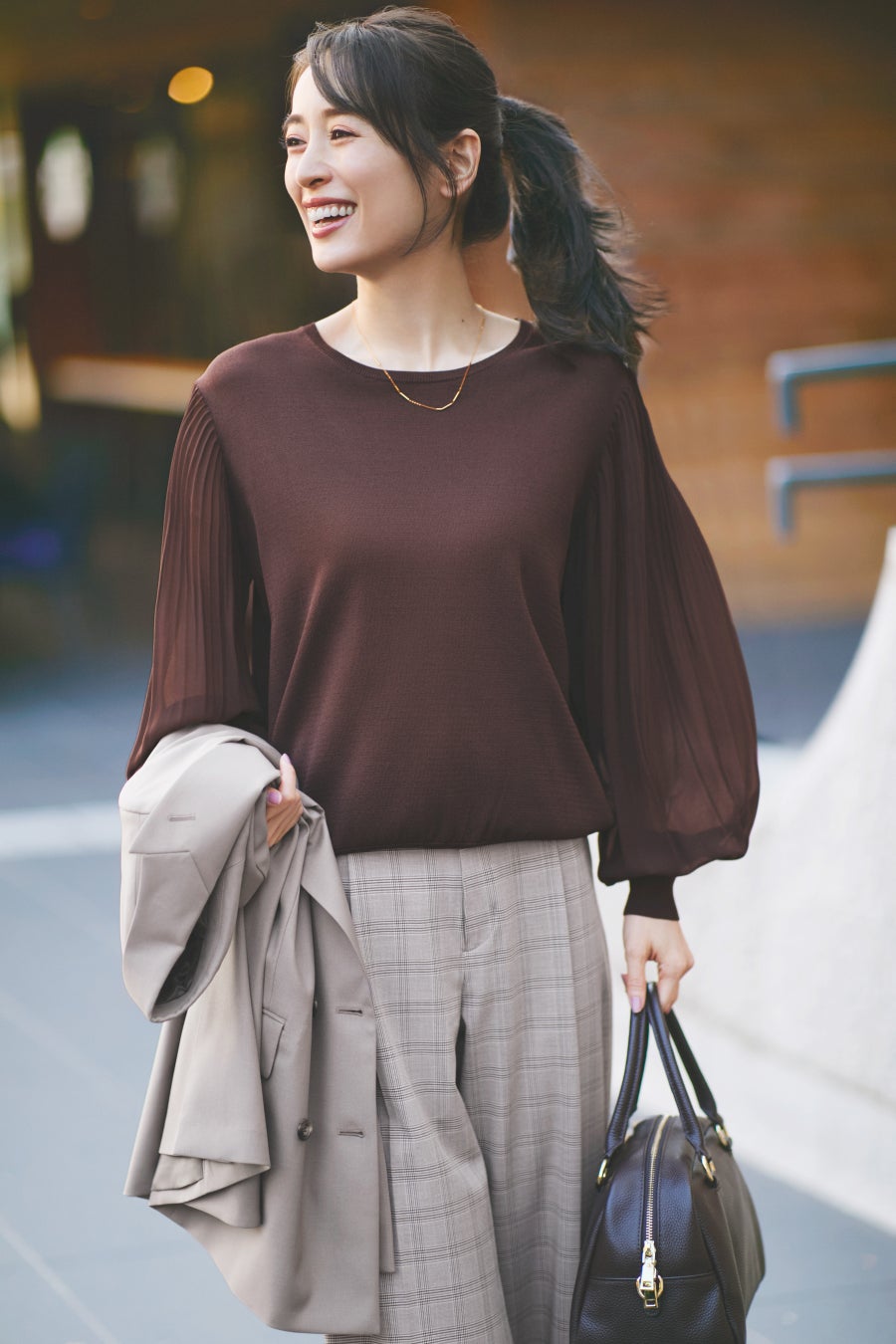 ②トレンドのグレージュとチェック柄でこなれ感のある装いに