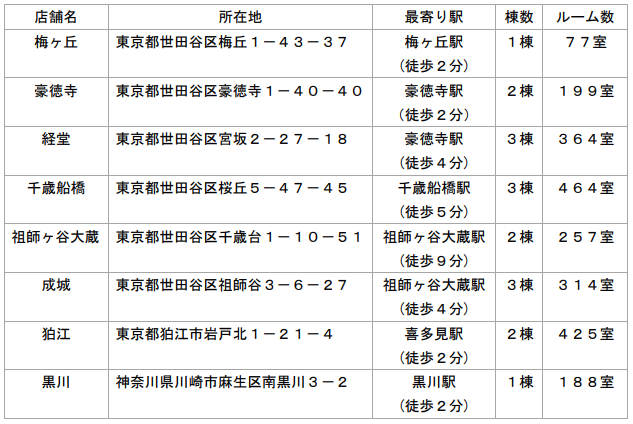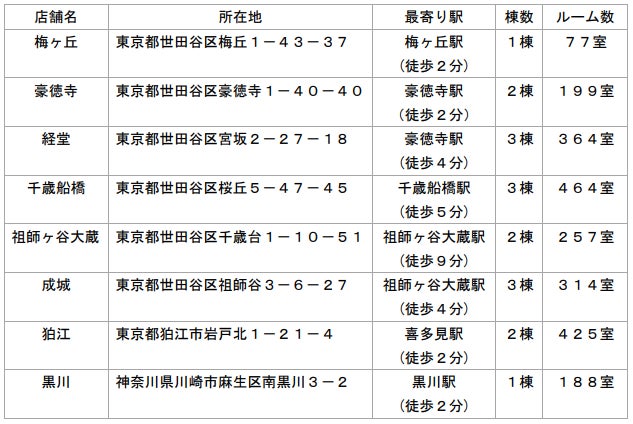 千歳船橋店、祖師ヶ谷大蔵店、成城店、狛江店、黒川店
